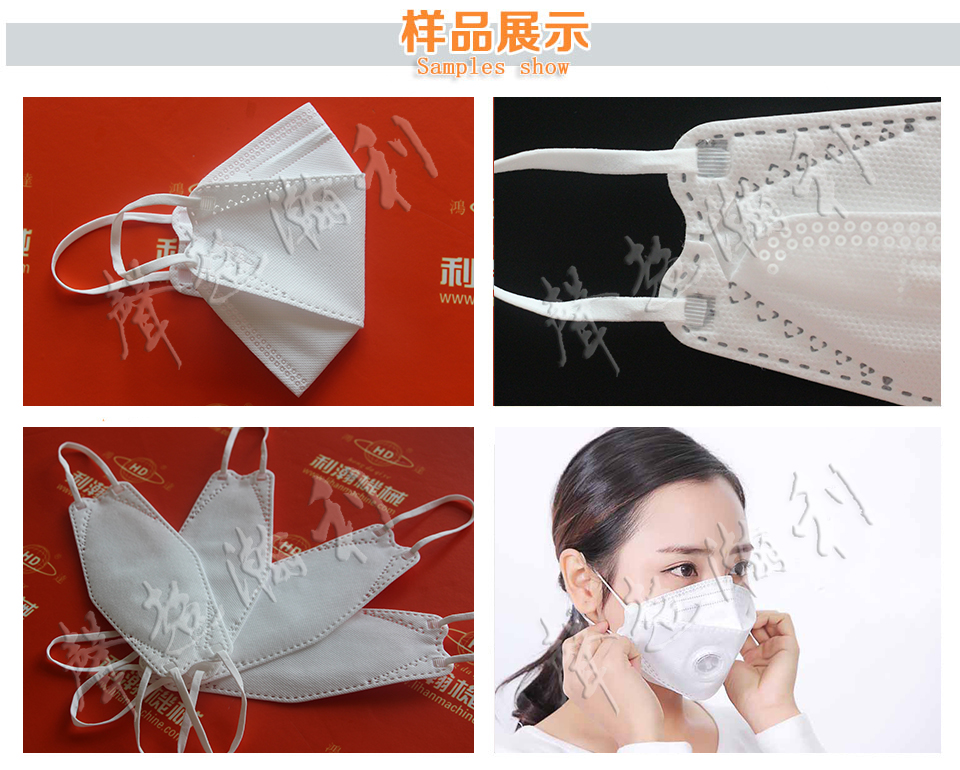1.設(shè)備采用超音波焊接方式將松緊帶熔合于魚型口罩本體外側(cè),該機(jī)是魚型口罩口罩生產(chǎn)后尾一道工序;