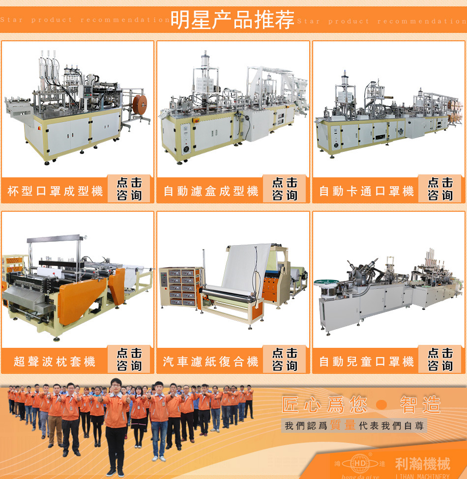 4、此款設(shè)備只需再裝備一臺全主動杯型口罩機,就可以出產(chǎn)出很多款商場緊銷的杯型口罩產(chǎn)品來 。