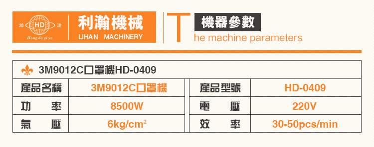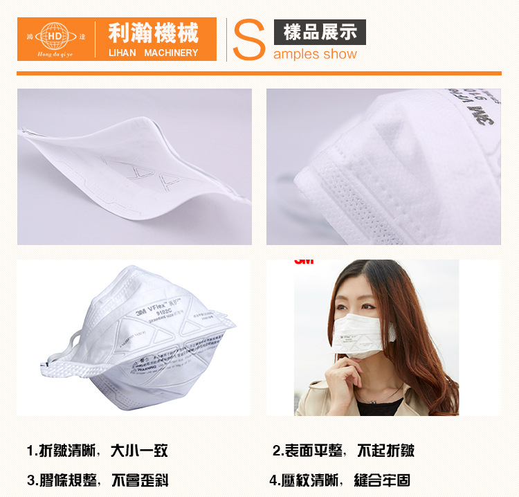 “鴻達”牌3M9012C口罩機,本機自動化程度高, 經過程序控制,可做到口罩壓紋、上鋁條、穿孔、半數、切邊一次成型,特別的制造工藝保證紋理清析、在出產時口罩不變形,不損原資料且可大極限的削減資料糟蹋,有用的保證了出產出的口罩質量
