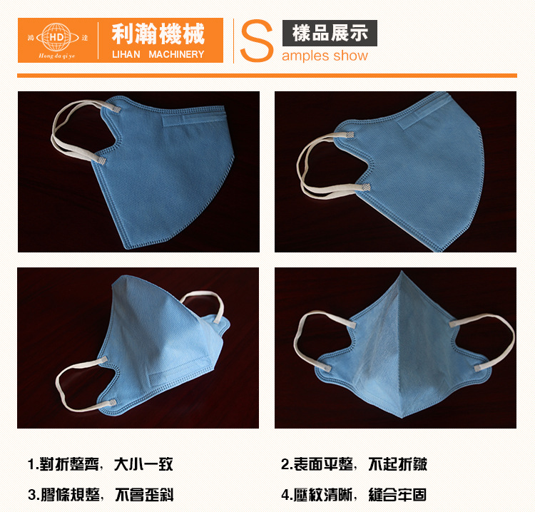 3.出產(chǎn)的制品,鼻梁條貼合結(jié)實(shí)、口罩外見平坦均勻、縫合結(jié)實(shí)。