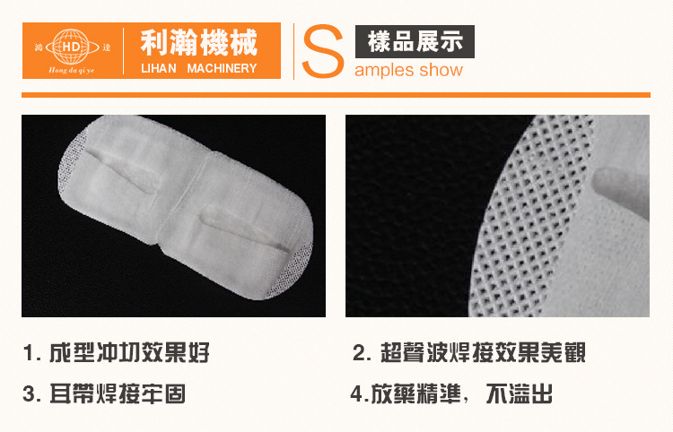 全主動眼灸貼機器選用主動置放藥點,熱壓成型,超聲波焊接,彈性無紡布作為耳帶,變頻調速一次成型,操作極端簡略便利,速度快,效益高。