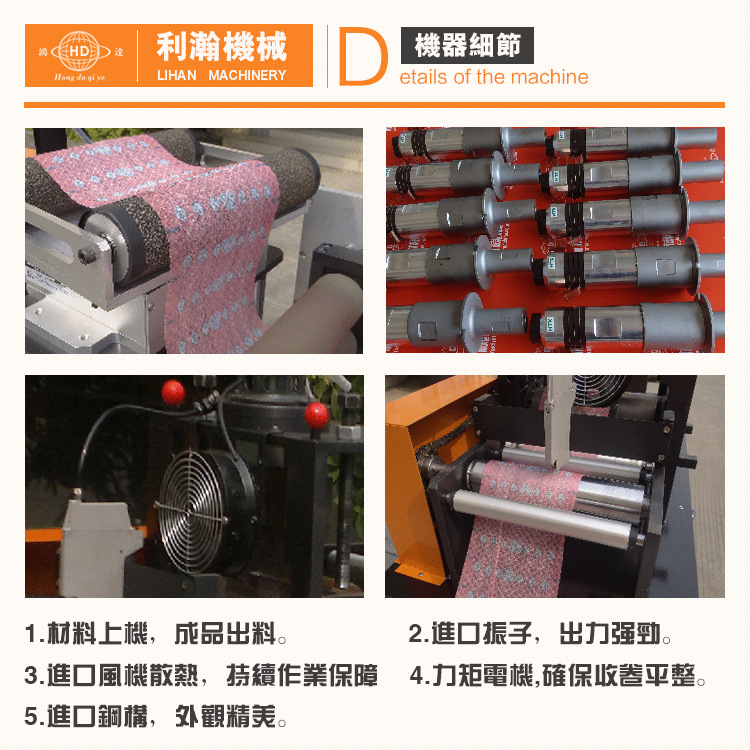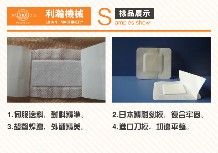 產(chǎn)品裝備及特色:為出產(chǎn)無紡布創(chuàng)可貼專用機(jī)。從送料至制品全為主動化操控,產(chǎn)能可達(dá)10--20米/min。主動張力操控。主動循邊操控。可調(diào)式超音波熔接。全機(jī)採用鋁合金結(jié)構(gòu)
