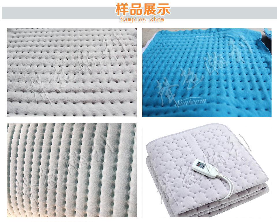 全自動電熱毯自動布線,本設備自動送料,自動展平,利用超聲波多點壓合,紋路清晰、縫合結實,其縫合時效率高(依據規格計算,焊點間距采用PLC程控,和伺服電機進行驅動,精度高,可根據客戶要求定做焊點形狀焊點,且機械的穩定性良好,具備長時間大批量生產 ,同時設立空位上料,可以達到機器生產不同材料的效益;同時具備替換模具成本較低、方便快捷之特點具備替換模具成本較低、方便快捷之特點, 電熱毯大小尺寸可動調節,焊點花型可根據客戶要求定做.