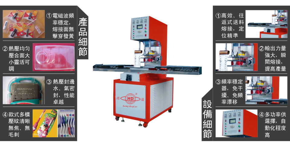 “鴻達(dá)”牌5-15KW單頭推盤式高周波熔接機(jī)是我司為提高環(huán)保理念而設(shè)計(jì)出的新產(chǎn)品,高周波(高頻機(jī))塑膠熔接機(jī)(又名高周波塑膠熔接機(jī)),它是利用高頻電場(chǎng)使塑料內(nèi)部份子振蕩產(chǎn)生熱能而進(jìn)行各類制品熔合是塑料熱合的設(shè)備,周率穩(wěn)定。本機(jī)振蕩周率采用國際工業(yè)波段13.56MHZ或27.12MHz,輸出周率穩(wěn)定,符合國際標(biāo)準(zhǔn),適合各地使用。高頻熱合機(jī)在工作或靜止時(shí),無論是突然遇到停電還是停氣時(shí),或者是通電還是通氣時(shí),機(jī)器都是靜止?fàn)顟B(tài),保持原來位置,不會(huì)突然上升或下降;大大提高工人操作安全問題。低損耗同軸振蕩器,同調(diào)調(diào)諧器,高頻熱合機(jī)輸出力強(qiáng)縮短熔接時(shí)間,提高產(chǎn)量。